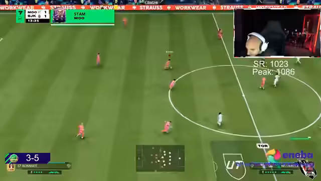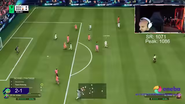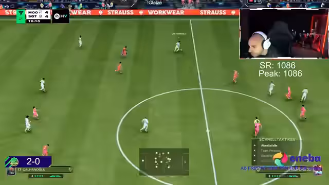 03:33:43Der Streamer analysiert sein Wechselverhalten zwischen Formationen: Bei Rückstand stellt er von offensiv (4-4-2) auf defensiv (4-5-1) um, was aber zu Ballbesitzproblemen führt. Er kritisiert diesen als 'falsch' empfundenen Mechanismus, da er trotz Rückstand gezwungen ist, defensiver zu spielen, um überhaupt an den Ball zu kommen – was wiederum seine offensive Wirkung mindert und zu weiterem Frust führt.