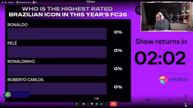 01:50:06Die Unterhaltung wechselt zu EA FC 26, wobei verschiedene Spielzüge und Taktiken besprochen werden. Der Streamer ist frustriert über seine Gegner, die viel Glück mit Zufallstoren haben. Er kritisiert die Spielstile der Gegner und gibt Einblicke in seine eigenen Spielansätze, wie z.B. gegen 4-5-1 Formationen zu spielen. Die Drops für das Spiel sind für 19 Uhr angekündigt.