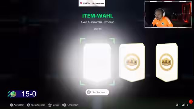 03:08:48Nach dem erfolgreichen Ende des Spiels mit 15-0 freut sich der Streamer über die Belohnungen. Er hebt hervor, dass er nicht primär auf Coins aus ist, sondern auf spielereigene Spieler, die er mag. Er öffnet verschiedene Pack und zieht hochwertige Karten wie Icons (Zola, Blanc, Gerrard, Del Piero) und Inform-Spieler (Alisson). Er bewertet die Packs als sehr gut und zeigt sich zufrieden mit den gezogenen tradablen und untradebaren Karten, auch wenn einige ihn nicht benötigen.