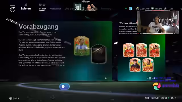 04:09:37Der Streamer plant, seine Stream-Zeiten anzupassen, indem er um 9 Uhr startet, um die Mittagsschläfchen-Zone zu umgehen. Er ist auf der Suche nach einem starken Spieler wie Copama, der wegen seiner langen Beine schwer zu fangen, aber nicht sehr beweglich ist. Der Fokus liegt darauf, durch Packs Icons wie RF Garincha zu ziehen und Coins zu sammeln. Eine gezielte Suche nach einem Haus wird angedeutet und der Streamer bittet um Unterstützung durch Zuschauerinteraktion, wie das Anschauen von Werbung. Sein Ziel ist es, mit einem starken Team, das unter anderem Raoul, Messi und Winnie umfasst, zu testen, ob die Formation mit Messi als Falsche Neun und Flügelmotoren offensiv überzeugt.
