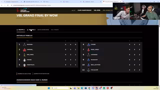 01:39:15Es wird der aktuelle Stand der Rangliste und der weitere Spielplan der Playoffs besprochen. Umut spielt als letzter der einen Gruppe gegen den Ersten der anderen Gruppe, Nasada oder Chaser. Levi Finn und Sean haben sich bereits qualifiziert, sodass 12 von 16 Teilnehmern für das Hauptturnier in Hamburg feststehen. Die verbleibenden Plätze werden in den nächsten Minuten entschieden.