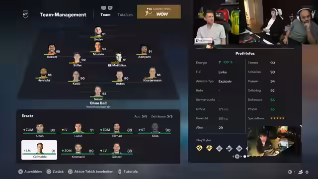 01:52:45Im Spiel zwischen GISTEN und Koray werden taktische Entscheidungen analysiert. Die Entscheidung, ein 4-4-2 mit falscher Neun zu spielen, wird als 'Müll' empfunden. Es wird diskutiert, ob Team Pressing ein fairer Vorteil ist und wie schwer es ist, gegen eine stärkere KI zu spielen, wenn man zurückliegt. Die Konsistenz der Gegner und das Matchmaking in der Weekend League werden ebenfalls thematisiert.