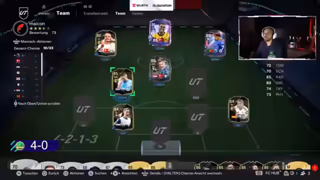 00:03:44Der Stream beginnt mit dem Eintritt in den Maicon Cup. Der Streamer wählt ein Team, nachdem er sein vorheriges Squad verloren hat, und stellt Spieler wie Adeyemi, Alfonso Davies und Jules vor. Er äußert sich kritisch über die niedrigen Bewertungswerte mancher Spieler, wie Davies, und entscheidet sich für eine offensive Aufstellung. Besonderes Augenmerk liegt auf der Verwendung von MyCon, einem 87er-Spieler, der als spielentscheidend gilt.