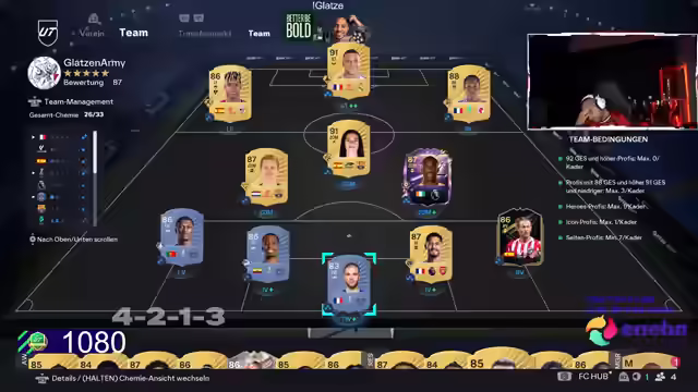 00:03:52Der Stream startet ohne Musik, dafür mit dem Ziel, in der Weltrangliste aufzusteigen, nachdem ein schlechter Tag mit Punktverlusten zu Buche schlug. Es wird über die aktuelle Platzierung (Platz 17) und die Notwendigkeit einer Winstreak gesprochen. Der Streamer experimentiert mit der Kameraeinstellung als eine Art Glücksbringer. Es folgen Überlegungen zu Spielertransfers und taktischen Anpassungen, wobei Namen wie Ginola, Jaja Touré und Caicedo fallen. Der Streamer äußert den Wunsch, Ginola zu verpflichten, obwohl dafür einiges an Kapital nötig wäre und das Teamgefüge möglicherweise darunter leiden würde. Es wird überlegt, ob Touré im aktuellen Spielstil optimal eingesetzt wird und ob defensive Mittelfeldspieler wie Caicedo eine sinnvolle Ergänzung wären.