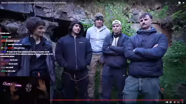 01:31:39Der Stream wechselt zum eigentlichen Hauptformat: eine Reaktion auf ein Video des Kanals 'Roofless'. Der Streamer stellt das Team des Videos vor, bestehend aus Stefan Pütz, Johnny Münster, Alex und Jonas, und betont die beeindruckende und gefährliche Mission: das Abseilen in Europas größtes Bunkersystem in 40 Metern Tiefe. Die Vorfreude auf die actiongeladene Mission ist spürbar.