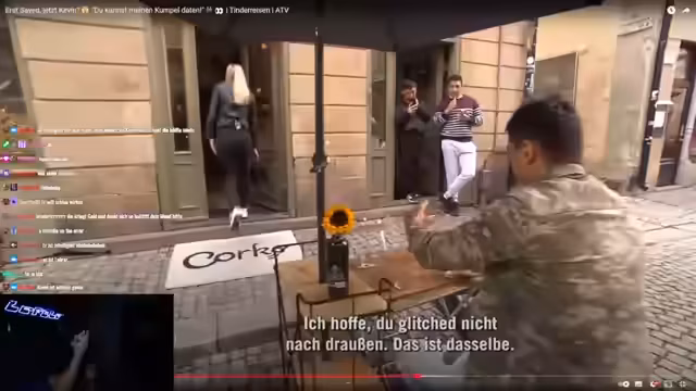 01:40:37Zayed hat ein verregnetes Camping-Date mit Karin in Stockholm und flüchtet mit ihr in eine Bar. Der Chat fragt sich, was mit den 1000 Bitcoins von Default passiert ist, und es wird klargestellt, dass diese von den Behörden beschlagnahmt wurden und unzugänglich bleiben. Syed plant bereits das nächste Date mit Isabel und rappt für Karin über das Stockholm-Syndrom, obwohl sie kein Wort versteht. Er fragt Karin, ob sie ihn mag, was der Streamer als dumme Antwort kritisiert. Karin möchte nach Hause gehen, und Syed ist traurig, aber er bietet Karin an, Kevin zu treffen, der im selben Hotel ist. Syed überrascht Kevin, indem er ihm ein Date mit Karin verschafft, nachdem er ihr Fotos von ihm gezeigt hat und ihr erzählt hat, dass er ein Gentleman, sehr intelligent und gebildet ist. Syed droht Kevin scherzhaft mit einem Hammer, falls er das Date vermasselt.