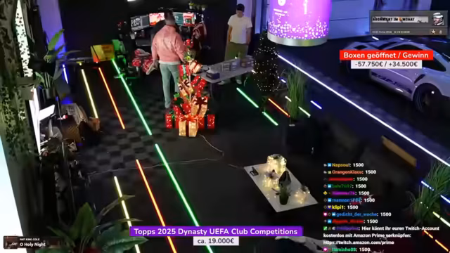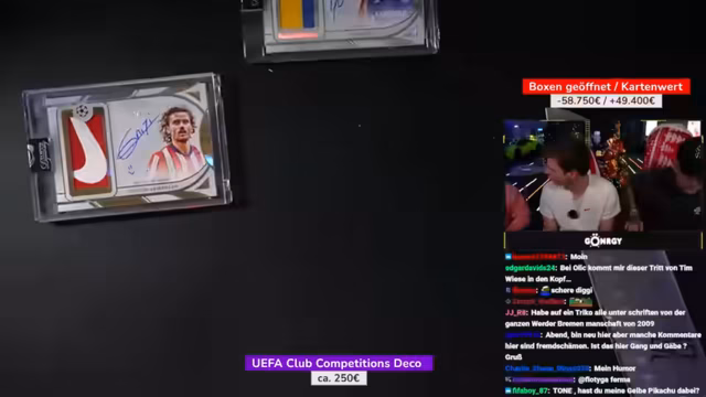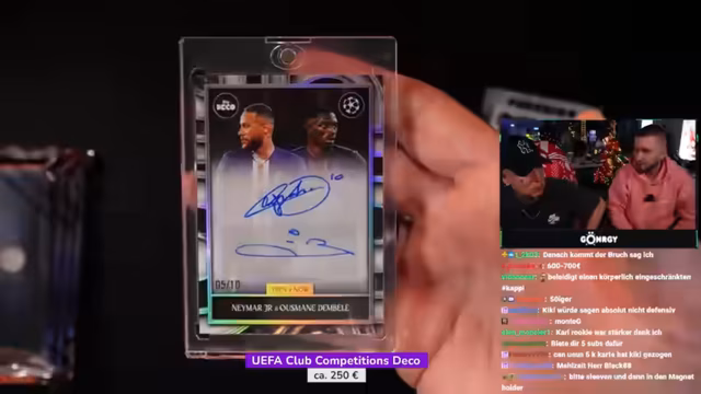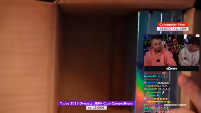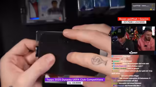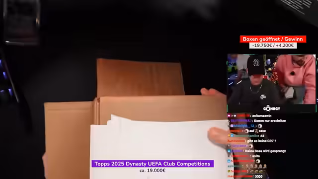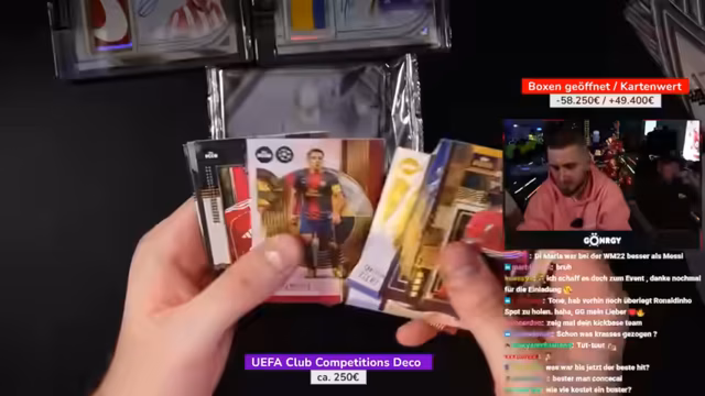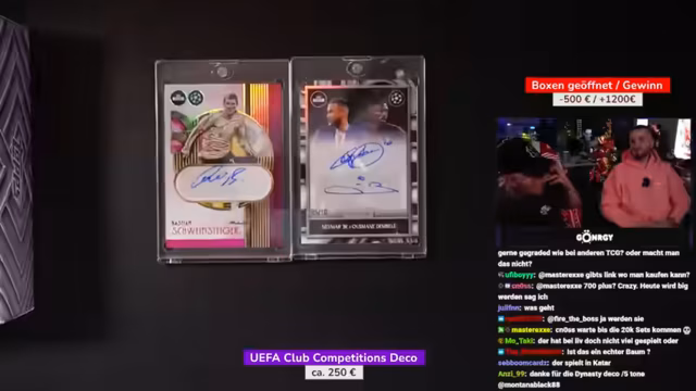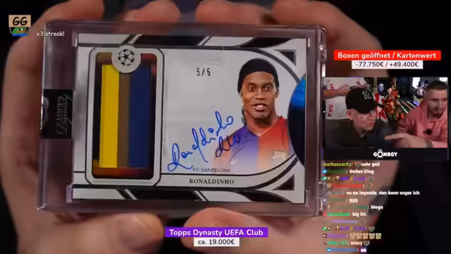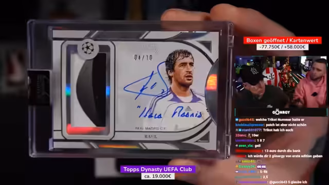 02:07:27Ab 7647 Sekunden wird Marcels Case als 'Godpack' gefeiert: Neben der Lamine-Yamal-Karte enthält es eine Zidane-Legendenkarte (2.800 Euro Wert), eine Kaká-Inscription mit UCL-Debütdatum (3.600 Euro) und eine Steven-Gerrard-Dual-Karte im Liverpool-Design (1.000-1.500 Euro). Die Kombination aus Seltenheiten und namhaften Spielern macht dieses Case zum Highlight des Streams, wobei der Gesamtwert auf über 15.000 Euro geschätzt wird.