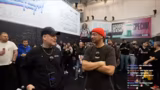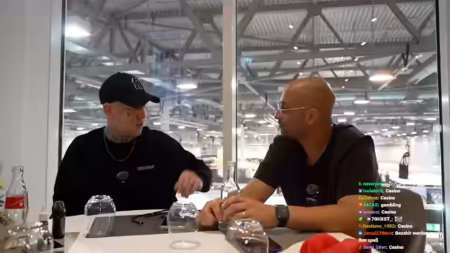 00:54:10Der Streamer und Jean-Pierre Kraemer besuchen den gemeinsamen Stand von Gönnergy. Für jeden gekauften Artikel gibt es ein eiskaltes Gönnergy-Getränk als Gimmick. Beim Betreten des Standes werden sie von einem Mitarbeiter empfangen und eine Vielzahl an Artikeln, wie T-Shirts und Pullovern, gezeigt. Es wird über die Preise, die Materialien und die Designphilosophie der Kleidung gesprochen, darunter ein Lamborghini-Pullover und ein T-Shirt im Volto-Design.