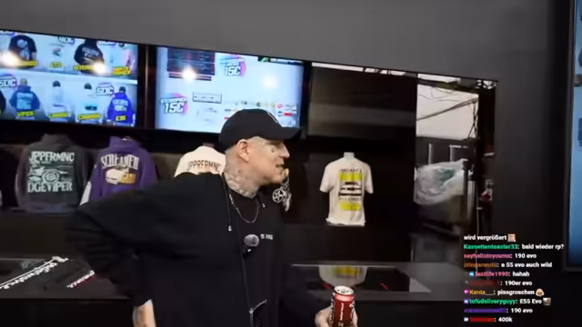 00:52:15Jean-Pierre Kraemer und MontanaBlack diskutieren über teure Titan-Bremsklötze und die Herausforderungen des TÜVs in Amerika, wo solche Umbauten einfacher sind. Anschließend wird eine besondere Aktion in Jean-Pierres Shop vorgestellt: Jeder Kunde, der etwas kauft, erhält ein eiskaltes Gönnergy-Getränk gratis dazu. Diese Aktion wird von MontanaBlack als „geil“ bezeichnet. Während des Gesprächs wird auch über die Modemarke von Jean-Pierre gesprochen, die MontanaBlack für ihre Qualität und ihr Design lobt. Er erwähnt, dass er bei früheren Besuchen in Jean-Pierres Firma immer Kleidung mitgenommen hat, um seine Spritkosten zu decken. Die beiden Streamer spielen ein kleines Rollenspiel, bei dem MontanaBlack als Kunde ein T-Shirt und einen Pullover in Jean-Pierres Shop kauft und dabei die Gönnergy-Aktion in Anspruch nimmt. Besonders das Volto-T-Shirt findet Anklang. Die Szene verdeutlicht die enge Zusammenarbeit und den humorvollen Umgang der beiden.