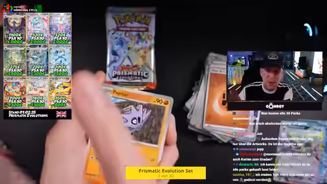01:33:12Monte beginnt mit dem Öffnen von Pokémon-Karten Sets und interagiert dabei mit dem Chat. Er erklärt, dass er insgesamt 100 O10 Prismatic Evolution Sets im Wert von ca. 11.000 Euro besitzt. Er geht auf Kommentare ein, dass er anderen die Karten wegkauft und erklärt, dass er diese nicht im Einzelhandel kauft, sondern über Reseller zum doppelten Preis. Er betont, dass theoretisch jeder die Möglichkeit hat, sich diese Sets zu kaufen, es aber am finanziellen Hintergrund scheitert. Er erwähnt, dass er zwei Sets für Zabecks Schwester und zum Verlosen reserviert hat. Er bereitet das Öffnen der Sets vor, indem er Sleeves und Toploader bereitlegt. Er fragt den Chat, ob sie bereit sind und freut sich auf das Öffnen der Sets.