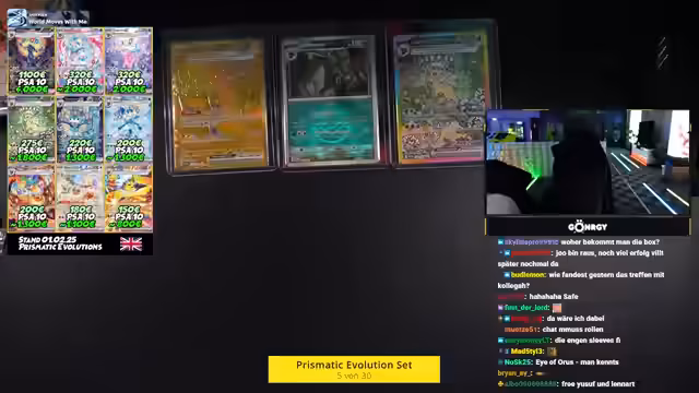 03:12:27Es wird über eine Promocarte von Prismatic Evolutions diskutiert, die unten rechts ein Pokéball-Zeichen haben könnte und bei PSA 800 kostet. MontanaBlack äußert Zweifel, ob dies nur bei der Special Edition der Fall ist und will sich rückversichern. Anschließend werden Karten aus einem geöffneten Set als beschädigt (gefickt) befunden, was zu Ärger führt, da dadurch möglicherweise wertvolle Full Art Karten zerstört wurden. Erleichterung macht sich breit, als festgestellt wird, dass nicht das gesamte Set betroffen ist. Später bedankt er sich bei Lasse Skio für 10 Naschis an die Community.