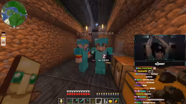 02:46:21Der Streamer bittet Stegi um Hilfe, da er erneut Diamanten verloren hat und seine Koordinaten durchgibt. Es entwickelt sich eine Diskussion über den Verlust von Diamanten und die Frustration über unglückliche Tode im Spiel. Stegi bietet an, Diamanten zu farmen, wofür der Streamer im Gegenzug Subs anbieten würde. Es folgt eine humorvolle Verhandlung über den Preis von 100 Diamanten. Anschließend wird über Insider-Begriffe wie "Liege wie" im Minecraft-Kontext gesprochen und die allgemeine Stimmung im Chat reflektiert. Norex und Stegi teilen ihre Baupläne für Craft Attack mit, darunter ein Monopoly-Feld und Minas Tirith mit einem Casino, was zu weiteren lustigen Interaktionen und Neckereien führt.