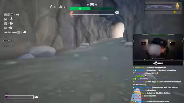 03:08:09Auf dem Weg durch eine Schlucht kämpfen die Streamer mit dem schwierigen Gelände. Sie müssen ihre Position ständig anpassen und finden einen Weg, einen Berg hochzuklettern. Unten müssen sie sich gegen einen Bär verteidigen. Die Zusammenarbeit ist hier entscheidend, um die Hindernisse zu überwinden und den Truck nicht zu verlieren.