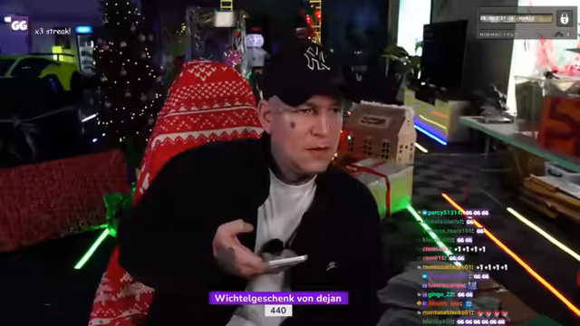 00:41:15Der Streamer beginnt nun mit der Verlosung der restlichen Wichtelgeschenke. Er beginnt mit einem Geschenk von Tomatolix, eine DJI Neo Drohne. Ein Zuschauer wird als Gewinner ermittelt, nachdem er das Codewort „379“ in den Chat geschrieben hat. Der Streamer betont die Wichtigkeit der korrekten Angabe von Direktnachrichten für die Gewinner, um den Versand zu sichern.