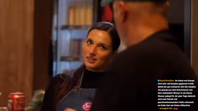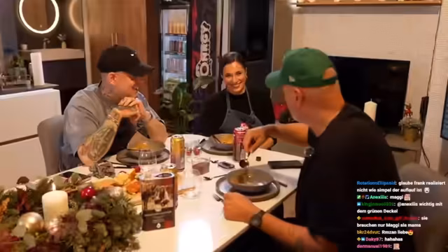 00:13:16Das geplante Weihnachtsmenü wird detailliert vorgestellt: eine Schokoladentarte als Nachtisch, eine türkische Linsensuppe und Lasagne Rolls mit Knoblauch-Kräuterbrot. Diese Auswahl verspricht eine vielfältige und festliche Mahlzeit. Während der Vorstellung des Menüs kommt es zu einem humorvollen Austausch über Sprichwörter rund um Hülsenfrüchte, was die entspannte Stimmung weiter unterstreicht. Ein besonderer Gast des Abends ist TV-Koch Frank Rosin, der als „Azubi“ des Streamers vorgestellt wird und die Gerichte später bewerten soll. Es wird eine gemeinsame Geschichte der beiden aufgedeckt, die 13 Jahre zurückliegt, als Sally bei einer Kochshow von Frank Rosin gewonnen und das Preisgeld in ihre erste Küchenmaschine und Kamera investiert hat, was den Grundstein für ihren Online-Shop und „Sallys Welt“ legte. Diese Anekdote zeigt die langjährige Verbindung und den Respekt zwischen den beiden.