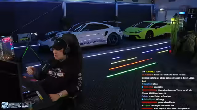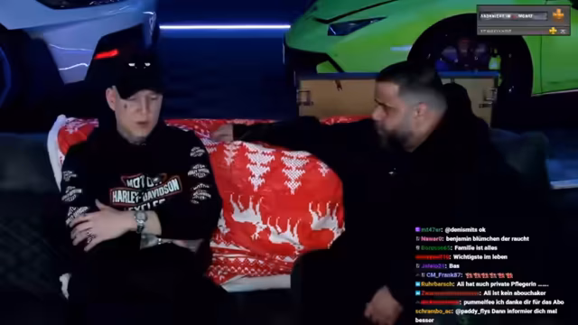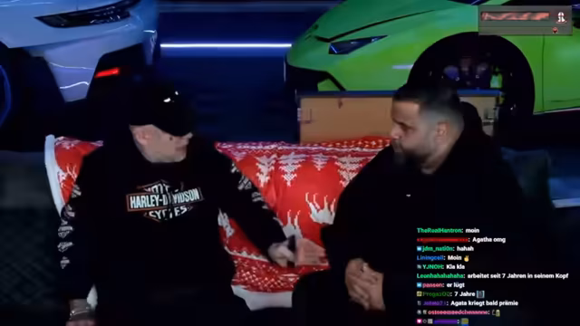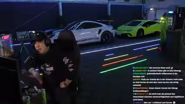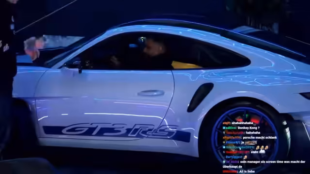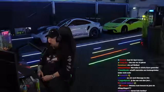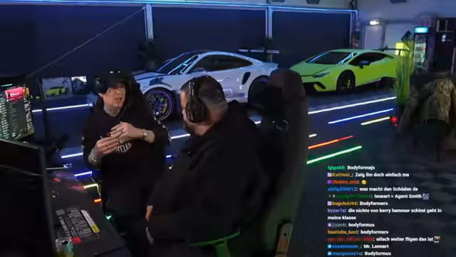 00:54:15Der Stream wechselt zu einem Praxistest von zwei Sportwagen, einem Lamborghini und einem Porsche. Ali Bumaye wird gebeten, sich in die Fahrzeuge zu setzen, um die Bequemlichkeit und den Einsteigekomfort zu bewerten. Der Porsche wird dabei als deutlich bequemer und komfortabler als der Lamborghini beschrieben, obwohl letzterer im Straßenverkehr eher Go-Kart-ähnliche Fahrspitzen vermittelt. Es folgt eine Diskussion über die Optik und die Vorlieben der Zuschauer, wobei der Porsche aufgrund seiner deutschen Ingenieurskunst allgemein als beliebter angesehen wird.