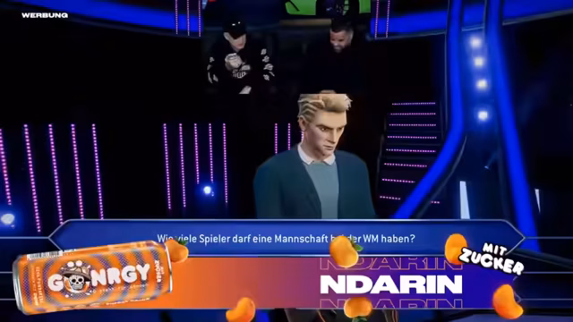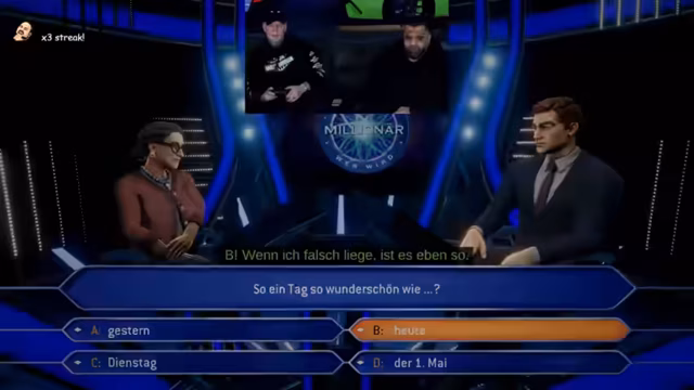 01:03:26Die Streamer beginnen eine Runde des Quizformats 'Wer wird Millionär?' gegeneinander, wobei sie jeweils 500 Euro für einen guten Zweck setzen. Während des Spiels kommt es zu humorvollen Aktionen wie verbalen 'gelben Karten' für kleine Provokationen. Beide nutzen verschiedene Joker wie den Publikums- und Telefonjoker. Die Fragen reichen von einfach bis sehr schwierig und umfassen Themen wie Kontinente, US-Bundesstaaten und Drogen-Erfahrungen. Der Streamer verliert eine knappe Frage bei 2000 Euro, was zu Enttäuschung über den unzuverlässigen Telefonjoker führt.