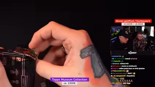 00:42:35Nach einer Zwischenbilanz über den Gesamtwert der bisher gezogenen Karten (ca. 600 Euro) und der Diskussion über mögliche Plattformen für den Verkauf (eBay vs. Auktionshäuser) wird mit dem Öffnen des nächsten Sets fortgefahren. Es werden weitere Hits wie eine Luka-Modrić-Karte (42/50) gezogen, die als wertvoll und mit einer schönen Unterschrift beschrieben wird. Der Streamer teilt eine persönliche Anekdote, wie er Modrić einmal traf und ihm ein Tattoo von dem Spieler zeigte, was für eine herzliche Interaktion sorgte. Der Fokus bleibt auf der Spannung bei den Kartenziehungen.
