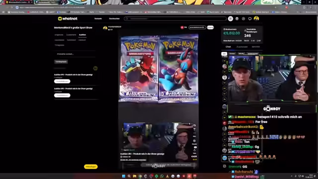 02:40:31Die Kooperation mit WhatNot wird fortgesetzt. Ein weiteres Auktionsprodukt, das 'Ruf der Legenden'-Booster, wird angeboten und für 301 Euro verkauft. Daraufhin startet ein Giveaway für zwei ähnliche Produkte mit einem Gesamtwert von rund 300 Euro. Zuschauer werden dazu aufgerufen, im Chat von WhatNot teilzunehmen, um eine Gewinnchance zu erhalten.