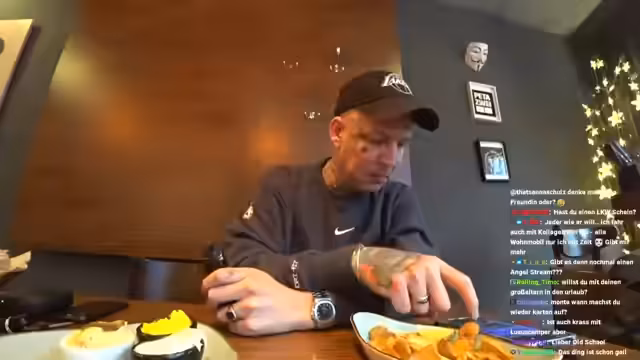 03:12:50Während der Fahrt und am Zielort geht es um die Freude am Essen. Der Streamer erklärt, dass Essen für ihn ein Belohnungssystem sei, besonders nach körperlicher Anstrengung. Er reflektiert dabei auch sein eigenes Gewicht und stellt sich übergewichtige Menschen als Albtraum vor, wünscht aber jedem Erfolg, gesund zu leben. Später isst er einen veganen Döner und bewertet ihn als sehr lecker und verdient.