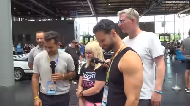 04:14:14Der Streamer geht in Halle 27 ein, wo private Fahrzeuge ausgestellt sind. Dort stellt er seinen eigenen, zum Verkauf stehenden Porsche 911 GT3 RS vor. Dann begegnet er Schradin, der ebenfalls privat auf dem Event ist. Schradin stellt sich vor und berichtet von seinem Werdegang: Seit 20 Jahren im Luxuswagenverkauf und seit rund zehn Jahren als Moderator für GRIP Motor Magazin, mit eigener RTL-Plus-Sendung in Aussicht.