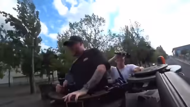 06:44:27Nach einer ersten Probefahrt, bei der der Spritverbrauch des Panzers beeindruckende Dimensionen offenbart (ca. 5-8 Liter pro Kilometer), steigt auch Zabex ein. Die Teilnehmer erleben die rawe Gewalt des Fahrzeuges bei Beschleunigung und Bremsung, was starke G-Kräfte verursacht. Die Fahrt wird als extrem intensiv und prägend beschrieben, wobei der Respekt vor der Maschine und ihrer Handhabung im Vordergrund steht.