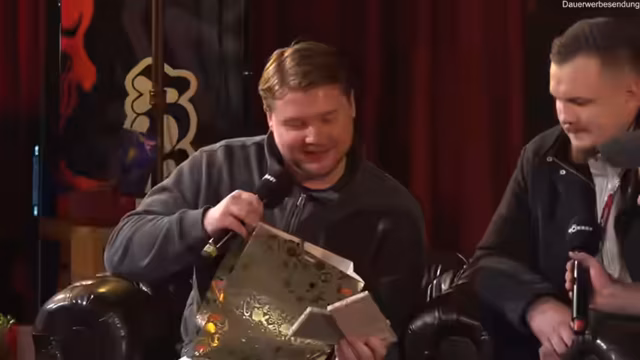 08:37:27Das erste Geschenk, das ausgepackt wird, ist eine Ukulele von Adi Totoro, worauf Aaron Droschke spontan ein Ständchen spielt. Die zweite Ziehung sorgt für große Aufregung, als Jean-Pierre ein Motorboat gewinnt. Das Geschenk ist ein echter Hingucker, hat TÜV und Anhänger und lässt sich perfekt für künftige Content-Projekte nutzen. Der Gewinn gilt als krasser Zufall und als absolutes Highlight des Events.