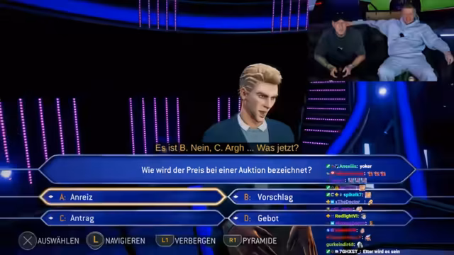 01:33:00Direkt nach dem Bowling treten die Streamer zu einer Runde des Quizspiels 'Wer wird Millionär' an. Die Regeln werden klar definiert: Jeder spielt eine Runde ohne Zeitdruck, hat alle traditionellen Joker zur Verfügung und kann zusätzlich einen Streamer-Kollegen als telefonischen Joker anrufen. Das Duell ist fair und spannungsgeladen angelegt, wobei die Gewinnerprämie auf 50 Geschenkartikel festgelegt ist.