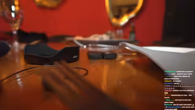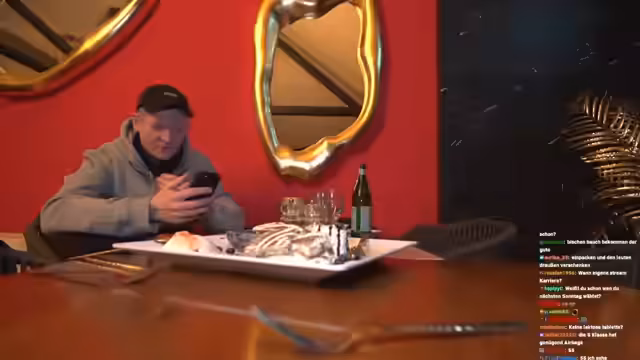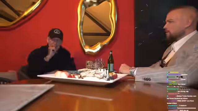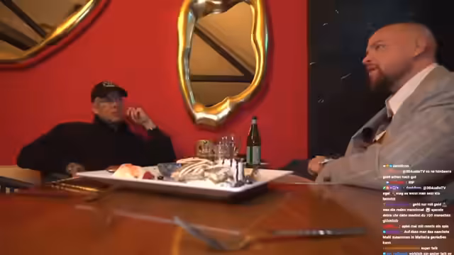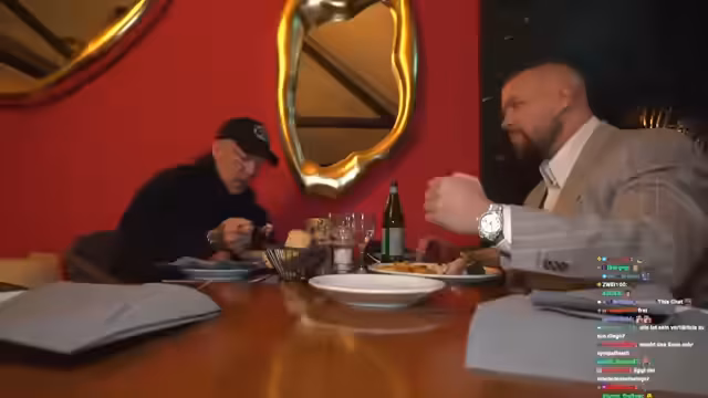 01:34:02Montanablack88 und Kollegah erreichen das italienische Restaurant und nehmen im Separée Platz, um ungestört zu sein. Kollegah äußert dringenden Harndrang. Montanablack88 kommentiert das Interieur und begrüßt den italienischen Chefkoch. Sie erkundigen sich nach den Spezialitäten des Hauses. Montanablack88s Frau und Schwester wollen die beiden kurz sehen, werden aber gebeten, zum Tisch zu kommen, da eine Kamera läuft. Lennart hat kein Stativ dabei, improvisiert aber mit dem Weitwinkelobjektiv. Montanablack88 bemerkt Lennarts 'Feindzwergen'-Look und betont seinen legeren Kleidungsstil ohne Krawatte. Er lobt Marc Gebauers Stil und lädt die Jungs zum Essen ein. Er bittet Yusuf um Feedback zur Kameraperspektive via WhatsApp und erklärt, dass er während des Streams nicht in den Chat schaut, um die Gespräche nicht zu unterbrechen. Er erklärt die TTS-Box Funktion. Im Chat wird über Politik-Gelaber diskutiert, was aber als Spaß abgetan wird.