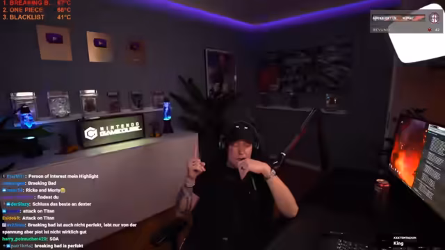 01:08:35Die Zuschauer werden gebeten, ihre Meinung zur perfektesten Serie abzugeben. Streamer selbst ist der Meinung, dass es keine perfekte Serie gibt, hebt aber 'Breaking Bad' und dessen Spin-off 'Better Call Saul' als nahezu perfekt hervor. Er verurteilt Serien wie 'The Walking Dead' für ihr negatives Ende und reagiert verärgert auf den Vorschlag 'Blacklist'.