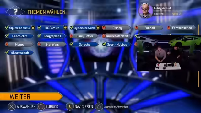 02:16:35Eine neue Runde von "Wer wird Millionär" beginnt. Die erste Frage dreht sich um den Spitznamen der mexikanischen Nationalmannschaft, die korrekt mit "El Tri" beantwortet wird. Anschließend wird nach dem obersten Teil einer Welle gefragt, wobei der Kandidat zwischen verschiedenen Begriffen schwankt, sich aber letztendlich für die richtige Antwort "Kamm" entscheidet. Es folgt eine Frage nach der Sportart, in der die Harlem Globetrotters ihr Publikum verzaubern, die ebenfalls korrekt mit Basketball beantwortet wird. Danach wird es kniffliger: Es geht um das Alter eines Tieres im Pferdesport, das als Jährling bezeichnet wird. Der Kandidat ist unsicher, ob er zocken oder einen Joker einsetzen soll, entscheidet sich aber letztendlich für die richtige Antwort: ein Jahr. Es folgen weitere Fragen zum Symbol des Kommunismus und zu Monopoly-Eigentumsfarben, die beide korrekt beantwortet werden. Der Kandidat befindet sich in einem richtigen Lauf und beantwortet die Fragen scheinbar mühelos.