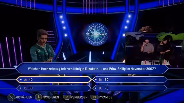 02:04:00Die Wer wird Millionär Runde geht weiter. Es wird eine Frage über Speisen gestellt, die nicht aus dem Ofen kommen, sondern aus dem Kühlschrank, welche korrekt mit Sorbet beantwortet wird. Danach folgt eine Frage über die Bedeutung der Zahlen 33, 45 und 78, welche mit Hilfe eines Telefonjokers richtig beantwortet wird. Die korrekte Antwort ist Schallplatten. Anschließend wird eine Frage nach dem Hochzeitstag von Königin Elisabeth II. und Prinz Philipp im Jahr 2007 gestellt, bei der erneut ein Telefonjoker, nämlich Schradin, zum Einsatz kommt. Auch diese Frage wird korrekt beantwortet. Es wird über die Schwierigkeit der Fragen diskutiert und darüber, dass Glück eine Rolle spielt. Es folgen weitere Fragen zu Sport und Harry Potter, die jedoch nicht erfolgreich beantwortet werden können. Es wird überlegt, warum die Fragen so schwer sind und woher man das Wissen haben soll. Am Ende scheitert der Kandidat an einer Frage über Harry Potter Charaktere und ihren Bezug zu Athener Gesetzesgebern.