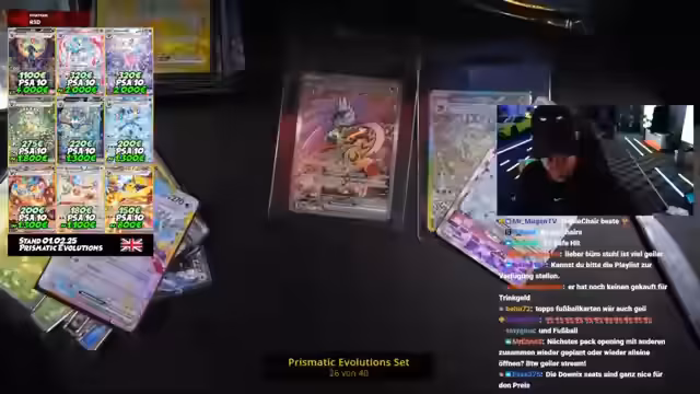03:14:31Nachdem mehrere Sets keine wertvollen Karten hervorgebracht haben, landet der Streamer einen bedeutenden Full-Art Hit. Die Karte ist laut seiner Schätzung circa 300 Euro wert und würde bei einer Bewertung von PSA 10 etwa 1.800 Euro erzielen. Diese zufällige Wetteinlösung löst bei ihm große Freude und Begeisterung aus. Er entscheidet spontan, ein großes Gewinnspiel für die Community zu veranstalten und gibt den Startschuss für ein 1.500 Euro Preisgeld, das per PayPal oder Banküberweisung gewonnen werden kann. Die Teilnahme erfolgt durch das Eintippen der Zahl '1.500' in den Chat.