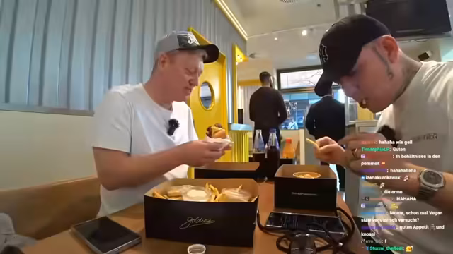 01:31:27Anschließend sucht die Gruppe nach einem Ort zu essen und landet bei Goldies, einer Burgerkette am Potsdamer Platz. Der Streamer ist vom Geschmack der Burger, insbesondere des vegetarischen Cheeseburgers, sehr angetan und bestätigt, dass es sich um einen der besten Burger handelt, die er je gegessen hat. Er lädt sein gesamtes Security-Team zum Essen ein und bezahlt die Rechnung. Zusätzlich versucht er, den Ladenbetreiber nach der extrem hohen Miete für den Standort am Potsdamer Platz auszufragen, was auf über 20.000 Euro geschätzt wird.