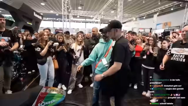 02:27:24Zurück von einem Essenstest, widmet sich der Streamer dem Thema Motorradführerschein. Im Chat werden Durchfallquoten diskutiert und er lädt die Zuschauer ein, ihm Theorie-Prüfungsfragen zu stellen. Er lässt sich verschiedene Prüfungsfragen zu Wildwechsel und Bremswegen bei Nässe stellen und beantwortet sie humorvoll und selbstkritisch. Parallel dazu unterhält er sich mit zufälligen Passanten, die ihn erkennen, und macht spontane Fotos, was die lockere und gesellige Atmosphäre der Messe widerspiegelt.