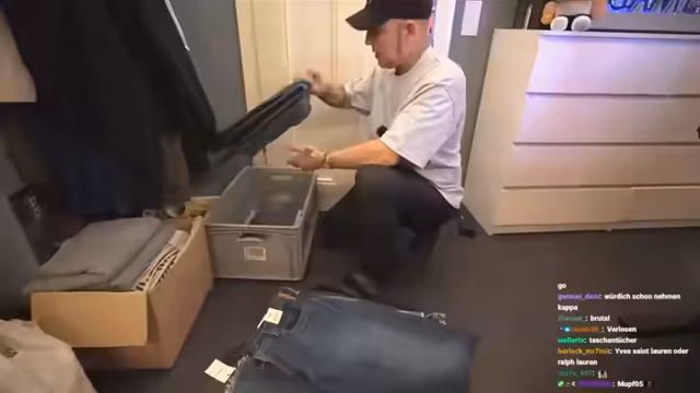 03:14:09Die eigentliche Mission des Streams ist die Umgestaltung des Ankleidezimmers, um Platz für Leas Kleidung zu schaffen. Obwohl der Chat zunächst vorschlägt, die Parfümsammlung so zu lassen, wie sie ist, entscheidet sich der Streamer dafür, Platz zu schaffen, um Lea entgegenzukommen und den Haussegen nicht zu gefährden. Er beginnt damit, die oberen Fächer seines Unterhosenschranks für Lea freizuräumen. Während des Aufräumens entdeckt er alte Picaldi-Jeans aus den 2000er Jahren, von denen er sich aus nostalgischen Gründen nicht trennen kann. Er probiert zwei davon an und schwelgt in Erinnerungen an die damalige Mode, bei der die Hosen in die Socken gesteckt wurden. Er findet, dass die Jeans immer noch 'Drip' haben und gut aussehen. Er findet sogar seine Lieblings-Picaldi-Jeans und probiert sie ebenfalls an, begeistert von dem Oldschool-Style. Er sortiert weiterhin T-Shirts aus, darunter Harley Davidson, ACAB und Goldies, um Kleiderbügel freizumachen. Er findet auch einige von JP Performance und Montana Cancel, die er behalten möchte.