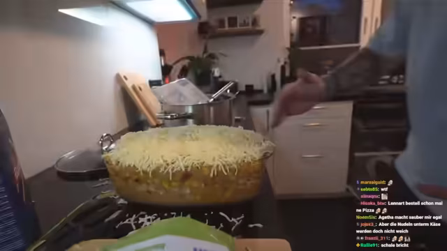 00:10:22Der Streamer beginnt mit den Vorbereitungen für seinen legendären Nudelauflauf. Er gesteht, dass er eigentlich keine Lust auf das Schnippeln von Gemüse hat und normalerweise vorgeschnittenes Gemüse kauft. Seine Frau Lea überzeugte ihn jedoch, das Gemüse im Stream selbst zu schneiden, um es authentischer zu gestalten. Er muss Paprika, Champignons und rote Zwiebeln schneiden. Während der Zubereitung stößt er mit einem eiskalten Cola-Sherry von Gönnergy an, seinem Lieblings-Energy-Geschmack. Er zeigt auch einen praktischen Getränkespender, den er online bei Ikea bestellt hat, nachdem er ihn auf TikTok gesehen hatte. Nach dem Schneiden des Gemüses, bei dem er sich über die Meinungen der Zuschauer zum Schälen von Champignons lustig macht, da er von Frank Rosin dafür gelobt wurde, dass er sie nicht schält, beginnt er mit dem Anbraten von Rinderhackfleisch. Er verwendet etwa ein halbes Kilo Hackfleisch und würzt es mit Salz und Pfeffer. Sobald das Hackfleisch durchgebraten ist, mischt er das geschnittene Gemüse und Mais hinzu, um eine Grundsubstanz für den Auflauf zu schaffen. Er betont, wie wichtig Mais für ihn ist und wie gut er zu allem passt. Währenddessen heizt er den Ofen auf 195 Grad Heißluft vor.