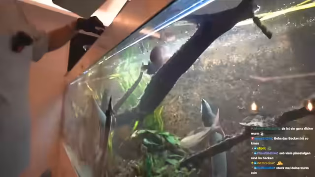 01:24:51Die Fütterung der größeren Fische mit riesigen Würmern wird als besonders spannend beschrieben, da die Würmer blitzschnell von den Fischen verspeist werden. Ein kleiner Schreckmoment entsteht, als die Fische bei der Fütterung so viel Action machen, dass Wasser aus dem Becken spritzt. Es wird erwähnt, dass Anfragen an Tropen-Aquarien und Tierparks gestellt wurden, um eventuell einige der größeren Aale abzugeben, da diese für das aktuelle Becken zu groß werden könnten, obwohl es bereits 3.700 Liter fasst. Die Diskussion um die Beckengröße für Feuerstachel-Aale wird mit einem KI-Assistenten geführt, der eine Mindestgröße von 200 Litern empfiehlt, was vom Streamer als Tierquälerei abgetan wird. Das Aquarium wird als beeindruckendes Herzstück des Wohnzimmers beschrieben, dessen Anblick sich jedoch mit der Zeit normalisiert.