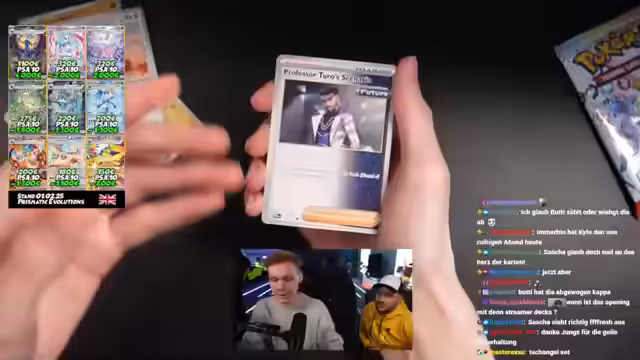 00:38:37Das erste Pack Opening beginnt. Es wird erklärt, dass die ersten Karten meist wertlos sind. Eine Reverse-Holo-Karte mit Pokéball ist gut. Es wird eine Evo-Entwicklungskarte für 40-50 Euro gezogen, was die Box schon wieder raus hat. Es wird erwähnt, dass es jetzt noch mehr Wahrscheinlichkeiten gibt, da es den Pokéball und den Meisterball gibt. Der Chat wird gefragt, ob näher rangezoomt werden soll. Die ersten Karten sind nicht besonders. Das Set ist schwierig, da die wertvollen Karten selten sind. Facecam-Fragen werden ignoriert. Es wird ein dicker Hit gewünscht. Es wird der Unterschied zwischen Pokéball und Meisterball erklärt. Eine Provokate ist in jeder Box enthalten und kostet 10 Euro, wird aber im Preis fallen. Viele der Pokémon sind unbekannt. Das Set ist beliebt, weil es im Handel erhältlich ist, aber hohe Werte erzielt werden können. Trainer-Karten sind gut. Budi wird gefragt, ob er Sexspiele im Pokémon-Kostüm gemacht hat, was er verneint. Es wird erwähnt, dass schöne Artworks dabei sind. Insgesamt wird der Wert des ersten Openings auf 60 Euro geschätzt.