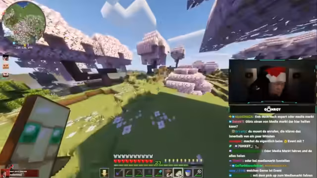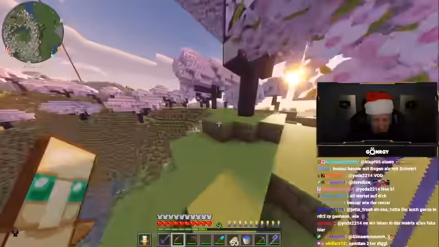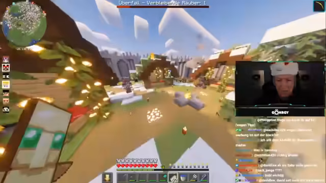 03:33:22Ein Anfrage wird gestellt, die Festung zu verschönern, insbesondere mit Bäumen am oberen Rand des Berges nahe einem Brunnen. Daraufhin beginnt die Interaktion mit einem Mitspieler, bei dem 120 Smaragde bestellt werden. Im Laufe des Handels beweist der Streamer seine Verlässlichkeit, indem er die 120 Smaragde abliefert und als Belohnung zusätzliche 39 Smaragde erhält. Die Transaktion erfolgt bei der Ankunft des Mitspielers an einem Warenhaus.
