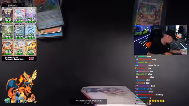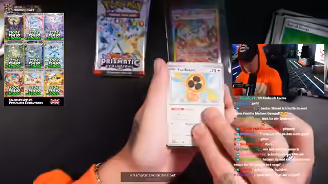 01:30:40Nach einer kurzen Pause beginnt der Stream mit dem Öffnen von 30 Pokemon Prismatik Evolution Sets, die einen Wert von etwa 3600 Euro haben. Die Sets sind neu auf dem Markt und werden im normalen Handel für 50 Euro, auf dem Graumarkt jedoch für 70 bis 100 Euro verkauft. Der Streamer hat die Sets aus eigener Tasche gekauft und möchte glückliche Pulls für seine Zuschauer ziehen.