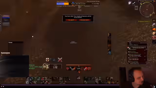 06:30:37Eine ausführliche Analyse einer missglückten Bosskampf-Situation im Scharlachroten Kloster. Die Gruppe stirbt aufgrund einer schlechten Pull-Strategie und fehlender Kommunikation. Es wird speziell die Rolle des Druiden diskutiert, die nur in Bärform blieb und nicht half, sowie das Verhalten des Hexers, dessen Dämon nicht richtig kontrolliert wurde. Der Streamer betont die Wichtigkeit von Klassenwissen und der Notwendigkeit, die Spielweise an die Situation anzupassen.