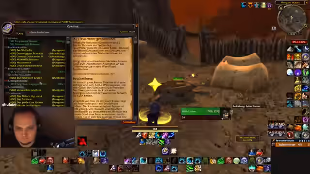 00:45:07Nach Blades Ankunft beginnen beide mit den Prequests. Die Stimmung ist gelassen und positiv. Sie unterhalten sich über den Tagesablauf, den Schlafmangel und die Müdigkeit, die beide vom WoW-Grind haben. Blade beschreibt seinen Tag, der mit einer Berufsschule endete. Sie starten mit einer Quest, die für Level 54 gedacht ist, aber als sehr entspannt für zwei Level-60-Spieler gilt.