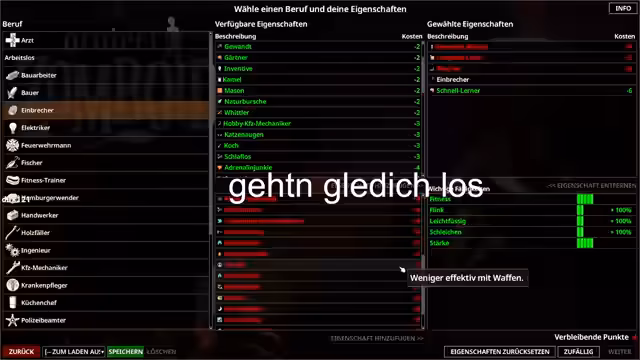 00:04:50Nachdem der Kaffee geholt wurde, beginnt der Streamer mit der Charaktererstellung. Er wählt den Beruf 'Einbrecher' ( statt 'Dieb' , der nicht verfügbar ist) und wählt Perks wie 'Schneller Lerner' aus, um mehr XP zu erhalten. Negative Perks wie 'Raucher' und 'Arbeitslos' werden ebenfalls gewählt, da sie mehr Punkte erlauben und der Streamer gerne einbricht. Die Auswahl der Perks gestaltet sich schwierig, da der Streamer unsicher ist, welche Kombination für einen Anfänger geeignet ist.
