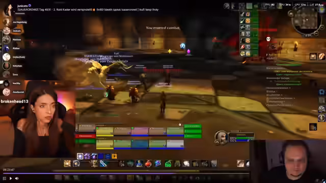 01:42:32Ein anderer Clip zeigt den Tod eines Spielers, der als Bug-Erlebnis interpretiert wird. Ein Spieler wird von drei Monstern angegriffen und versucht, seinen Paladin-Schild zu aktivieren. Der Streamer ist fassungslos darüber, dass die Animation des Schilds nicht wie erwartet funktioniert und der Spieler stirbt, obwohl er den Schild benutzte. Dies wird als technisches Problem der Spiel-Engine dargestellt. In einer anderen Situation wird kritisiert, wie ein Krieger drei Mobs gleichzeitig zieht (pullt) und die Agro nicht ordentlich halten kann.