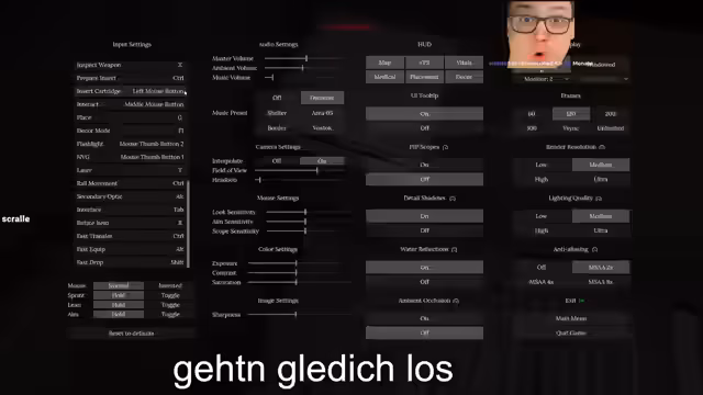 00:02:33Nach einigen technischen Startschwierigkeiten wird das Spiel Road to Vostok gestartet. Der Streamer navigiert durch das Menü und stellt verschiedene Einstellungen wie Schwierigkeitsgrade, Startkit und Wetterbedingungen ein. Er äußert eine anfängliche Verwirrung über die Steuerung und fehlende Untertitel, was den ersten Eindruck des Spiels beeinträchtigt. Die ungewöhnliche Darstellung der Umgebung und das Fehlen sichtbarer Beine beim Nach untenblicken sorgen für konfundierte Reaktionen im Chat.