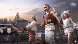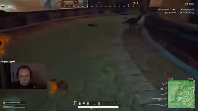 01:00:12Das Spiel beginnt mit einem engen Kampf nach der Landung. Das Team landet in der Nähe anderer Spieler, was sofort zu ersten Auseinandersetzungen führt. Sie befinden sich in der Blauen Zone und haben Nachbarn im Norden sowie in einem Gebäude auf Gelb, wo zwei Teams konfrontiert sind. Streamer identifiziert die Gegner über Teamnummern und Flaggen, betont aber, dass die Flaggen keine nationalen Zugehörigkeiten anzeigen. Die Situation eskaliert schnell, als ein Gegner down geht und Rauchgranaten geworfen werden, um den Verletzten zu decken oder den Kampf fortzusetzen.
