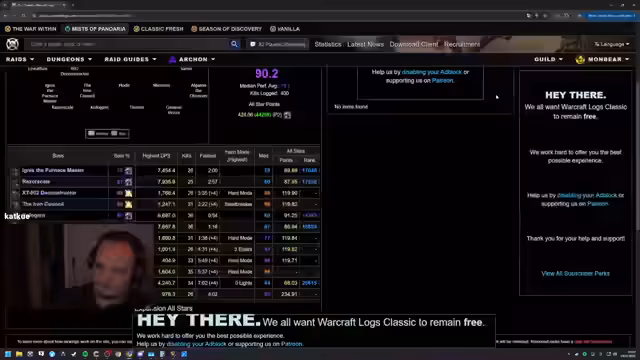 07:53:39Ein Zuschauer postet Logs eines Rang-1 Warriors im Arms- und Fury-Talentbaum, was den Streamer extrem beeindruckt. Dieser hatte sogar einen Level-1 Charakter erstellt, um dies auf Hardcore zu demonstrieren. Der Streamer schaut sich weitere Logs von Heilern an, die konsistent hervorragende Leistungen erbringen, und bietet einem Heiler mit soliden Parse-Ergebnissen direkt einen Platz in seiner Gilde 'Sauerkraut' an.