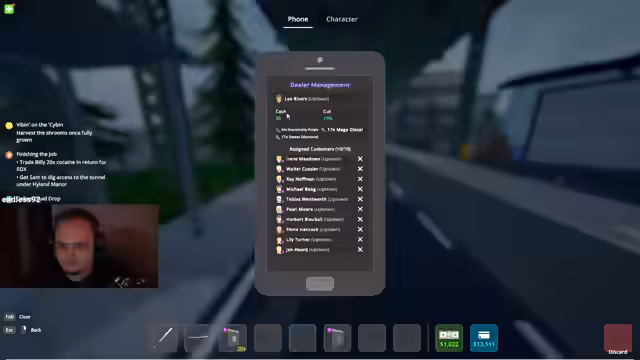 00:04:10Der Streamer nutzt die Dealer-App, um Kunden zuzuweisen und steht vor Herausforderungen bei der Organisation. Es werden Süchtige aus Downtown und Docks beliefert, um den Ruf zu verbessern. Der Fokus liegt auf der expansion in neue Gebiete wie Waylong und Uptown. Die App wird reaktiviert, um Nachrichten von Kunden zu erhalten und Lieferungen zu koordinieren.