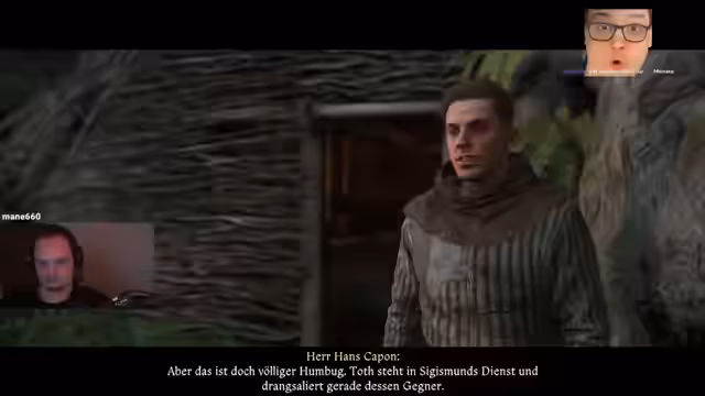 03:03:01Der Streamer und sein Begleiter machen sich auf den Weg zur Burg Trosky, um Herrn Capon zu treffen. Doch an den Toren werden sie abgefangen und der Streamer gibt sich als reicher Herr aus, was aber mit Verachtung und Misstrauen quittiert wird. Der vermeintliche Herr von Pirckstein wird beschimpft und als Bettler abgetan, was die schwierige soziale Dynamik und die verachtvolle Haltung des Adels gegenüber den einfachen Menschen aufzeigt.